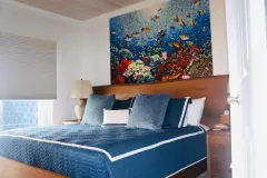 An expansive deck offers breathtaking beach views and ushers you to the open-plan living area, where you’ll discover an inviting atmosphere to relax as you walk in. The fully-equipped kitchen features ample cabinetry, stainless steel appliances, a wine chiller, generous countertops, an eat-in island, and majestic panoramas sure to inspire the home cook.