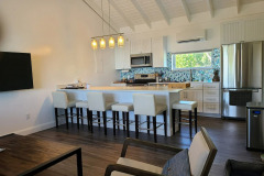 The property boasts a 4-bedroom, 4.5 bath and an expansive covered porch with multiple seating areas plus alfresco dining. Inside, an air-conditioned living area offers a relaxing atmosphere, where a glass slider enhances the tropical weather the moment you walk in. The kitchen features fine elements for the home cook, including stainless steel appliances, generous cabinetry, ample countertops, and an eat-in peninsula.
