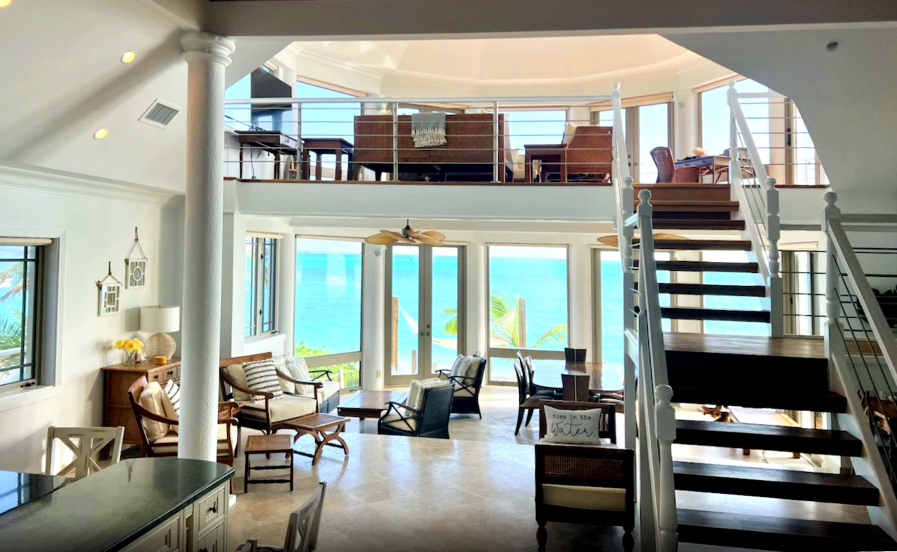 The interiors feature a palette of pristine white, light and earthy tones, and various shades of blue, exuding a refreshing and clean tropical vibe, with every space meticulously furnished and decorated. The open floor plan seamlessly connects the kitchen, living room, and dining room, creating a spacious and inviting ambiance. Floor-to-ceiling windows embrace a half-moon shape, offering a panoramic view of the mesmerizing turquoise waters that lie just steps away.