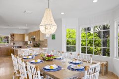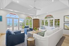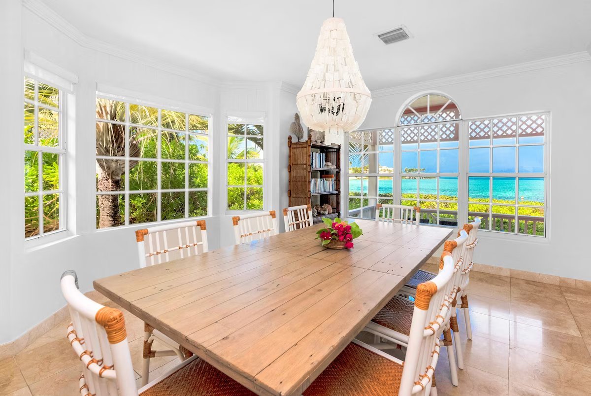 The interiors of the villa are adorned in a serene palette of white and light brown shades. Coastal-themed furnishings and decor effortlessly transport you to a seaside retreat. From the plush sofas and wooden furniture, to the carefully selected artwork and accents, each element adds to the overall coastal aesthetic. The outdoor space features chaise lounges and deck chairs inviting you to soak in the sun while enjoying views of the beautiful Bahamian turquoise waters.