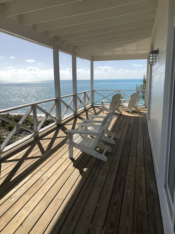 Outside is a wrap-around deck with seating and lounging areas – perfect for relaxing or getting a cup of coffee while enjoying the ocean views. The deck also has direct access to the white sand beach that surrounds the cottage.